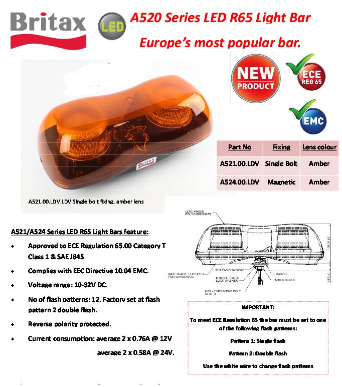 Britax A520 series is the latest Reg65 Highway Compliant LED Single Bolt fixing, amber lens lightbar
