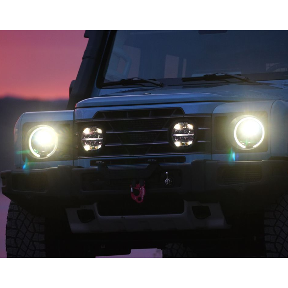 The INEOS Grenadier Grille Integration Kit includes a pair of Sentinel 7” High Performance LED driving lights, a wiring kit, and two precision-engineered mounting bracket surrounds that fit perfectly within the standard center grille of the Grenadier, replacing the factory-installed grille lights. For enhanced durability and security, the brackets are secured using the supplied self-tapping plastic screws.
