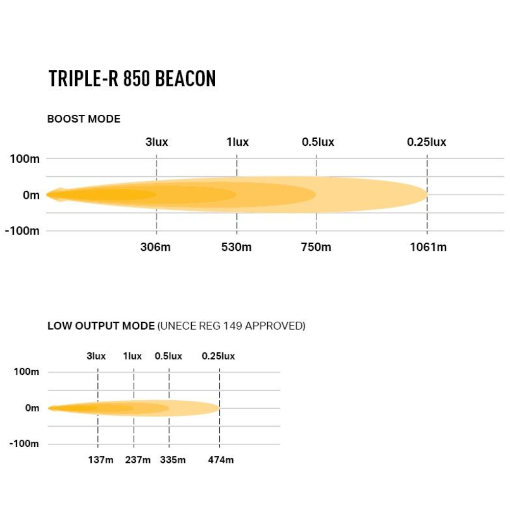 The lamp is also UNECE approved to Regulation 149 as a high beam driving light, through adoption of Lazer’s dual output Boost technology; controlled via quickly flashing the light off/on, the light can be quickly dimmed for avoiding glare when passing road-signs for example (flash-to-dim), or at any time programmed to always work in the high or low output modes, with the low output mode complying to the UNECE Reg149 as an on-road high beam driving light.