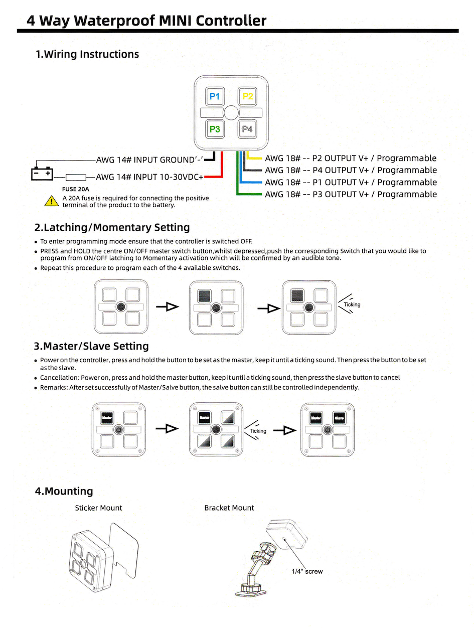 - All-in-one controller featuring 4 programmable switches (on/off or momentary) with integrated relays with a rating of 5amp per switch.